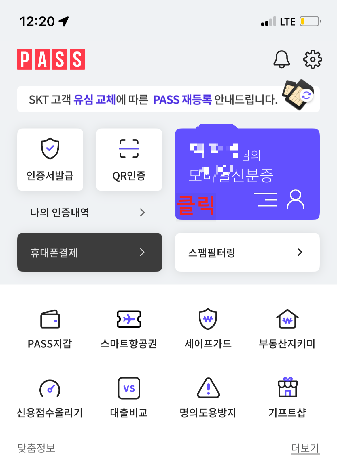 저는 이미 발급 받아서 위 이미지의 '클릭' 부분에 OOO님의 모바일신분증이라고 떠있는데