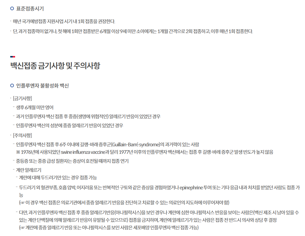 백신접종 금기사항 및 주의사항에 대해서는 질병관리청 홈페이지에 자세하게 나와 있습니다. 예방접종을 받으시면 안되는 분들, 연기해야 하는 분들의 기준에 대해서 안내되어 있고, 기타 표준접종시기 등도 확인하실 수 있으니 예방접종 받으시기 전에 꼭 확인하시고 가시기 바라겠습니다.
